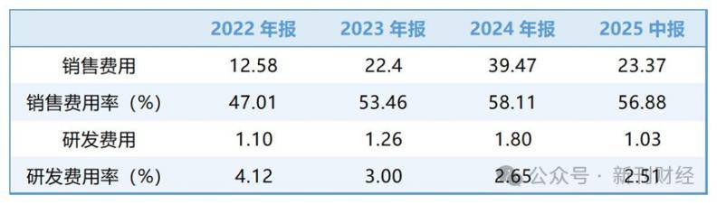 然而,这种模式的背后,暴露出一个严重问题——营销费用大幅攀升。同花顺数据显示,2022至2025年上半年,销售费用率从47%升至58.11%,今年上半年,销售费用已是研发费用的20倍。