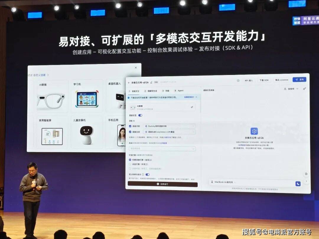 首先,它具有极低开发门槛。徐栋形容这个套件让开发变得像“拖拉拽”一样简单。套件集成了千问、万相、百聆三款基础大模型,并预置了十多款Agent和MCP工具。商家想做一个“会讲故事的玩具”或者“能看懂路况的眼镜”,不需要从头写代码,直接调用预置模组即可。