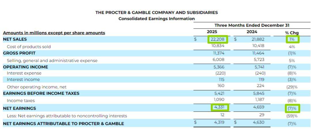 财报显示,2026财年Q2(2025年10-12月),宝洁净销售额同比微增1%至222.08亿美元(约合人民币1546.40亿元),但净利润同比下滑7%至43.31亿美元(约合人民币301.58亿元)。这一“增收不增利”的表现,主要受到原材料、关税等成本压力及集团战略性重组投入的影响。