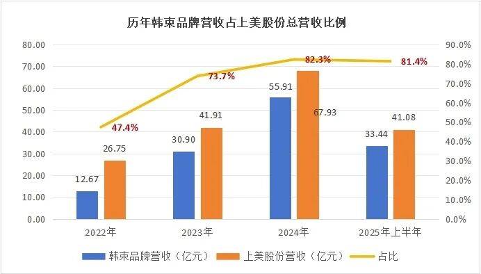 但在亮眼成绩单下,几乎是韩束品牌在“独舞”。从2022年的47.4%,到2023年的73.7%,韩束的营收占比逐年攀升。2024年韩束营收55.91亿元,占公司总营收比重高达82.3%,同比增长80.9%;2025年上半年,韩束营收33.44亿元,占比仍维持在81.4%,同比增长14.3%。
